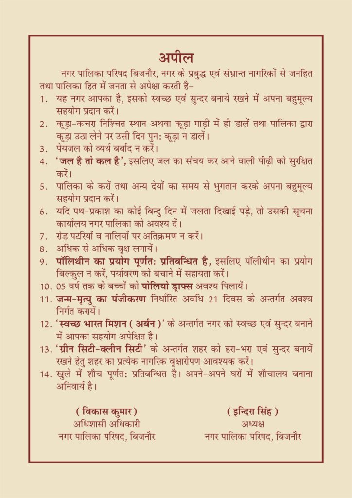 नगर पालिका बिजनौर को निर्देशित किया गया कि नगर के प्राचीन इतिहास, विशेष रूप से भरत-शकुंतला, महात्मा विदुर और महाभारत काल से जुड़े प्रसंगों को साइन बोर्ड, वॉल पेंटिंग और अन्य माध्यमों से प्रदर्शित किया जाए। इसका उद्देश्य बिजनौर की ऐतिहासिक विरासत को जीवंत बनाए रखना और पर्यटकों को इसके गौरवशाली अतीत से परिचित कराना है।