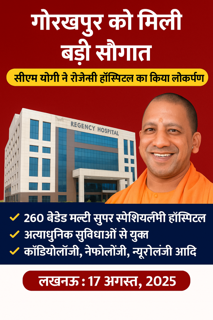 पूर्वी उत्तर प्रदेश के स्वास्थ्य ढांचे को नई मजबूती देते हुए मुख्यमंत्री योगी आदित्यनाथ ने गोरखपुर में 260 बेडेड अत्याधुनिक रीजेन्सी मल्टी सुपर स्पेशियलिटी हॉस्पिटल का लोकार्पण किया। सीएम ने कहा कि प्रधानमंत्री नरेंद्र मोदी के नेतृत्व में देश और प्रदेश की स्वास्थ्य सेवाओं में अभूतपूर्व सुधार हुआ है और यह नया अस्पताल उसी दिशा में एक ऐतिहासिक कदम है।