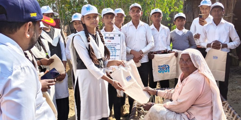गांव में गंगा दूतों ने लोगों को समझाया कि प्लास्टिक का थैला गंगा का दुश्मन है।