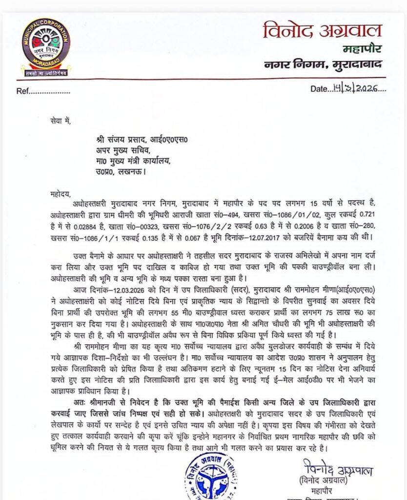 उत्तर प्रदेश के मुरादाबाद में प्रशासन और नगर निगम के बीच टकराव अब खुलकर सामने आ गया है। मुरादाबाद के भाजपा नेता और महापौर विनोद अग्रवाल ने प्रदेश के शीर्ष नेतृत्व और मुख्यमंत्री कार्यालय को एक भावुक पत्र लिखकर कहा है— “मेरा मान-सम्मान बचाओ, मुझे स्थानीय अफसरों पर भरोसा नहीं है।”