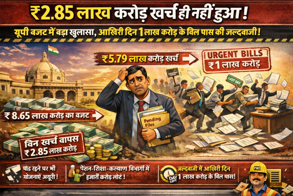 लखनऊ से सामने आए वित्तीय वर्ष 2025-26 के चौंकाने वाले आंकड़ों ने उत्तर प्रदेश की वित्तीय प्रबंधन प्रणाली पर गंभीर सवाल खड़े कर दिए हैं। राज्य सरकार के कुल ₹8.65 लाख करोड़ के बजट में से करीब ₹2.85 लाख करोड़ राशि बिना खर्च किए ही वापस हो गई, जबकि केवल लगभग ₹5.79 लाख करोड़ का ही उपयोग हो सका।